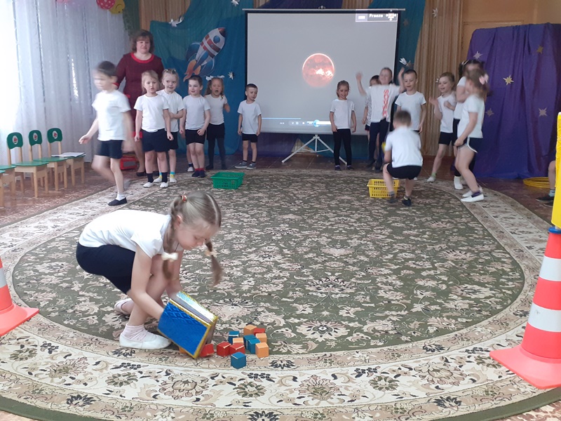 12 апреля воспитанники старших групп №2 и №5 отправились в Космическое путешествие. Ребята совершили виртуальный полет на планеты Солнечной системы. На Луне они перемещались в луноходах, на Венере разбирали камни в специальных рукавицах, на Марсе собирали марсианский песок, а на Нептуне исполнили веселый танец. Все ребята с большим интересом участвовали в эстафетах, старались победить и не подвести свою космическую команду.