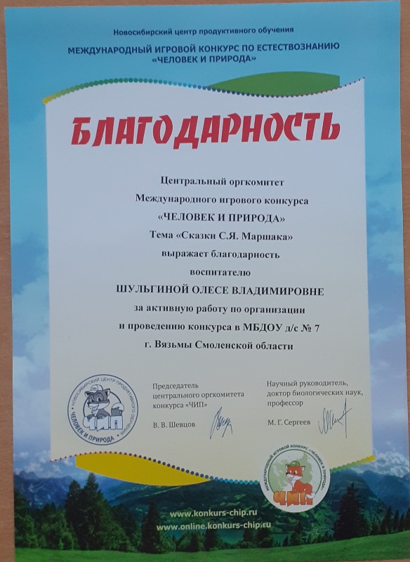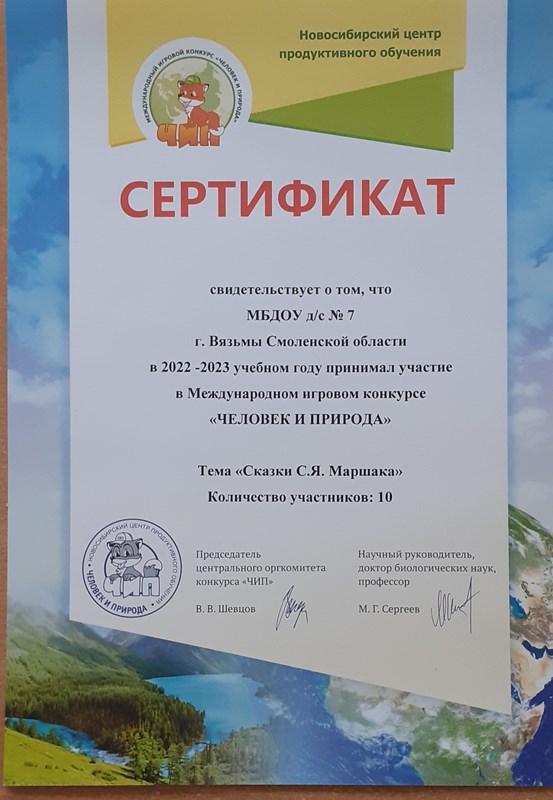Подведены итоги международного игрового конкурса "Человек и природа" – 2022. Воспитанники подготовительных к школе групп № 2 и № 5 под руководством воспитателя Шульгиной О.В. приняли участие в конкурсе ЧИП на тему: "Сказки С.Я. Маршака". Ребята показали высокие результаты, каждый участник этого увлекательного конкурса получил сертификат и подарок с символикой конкурса.