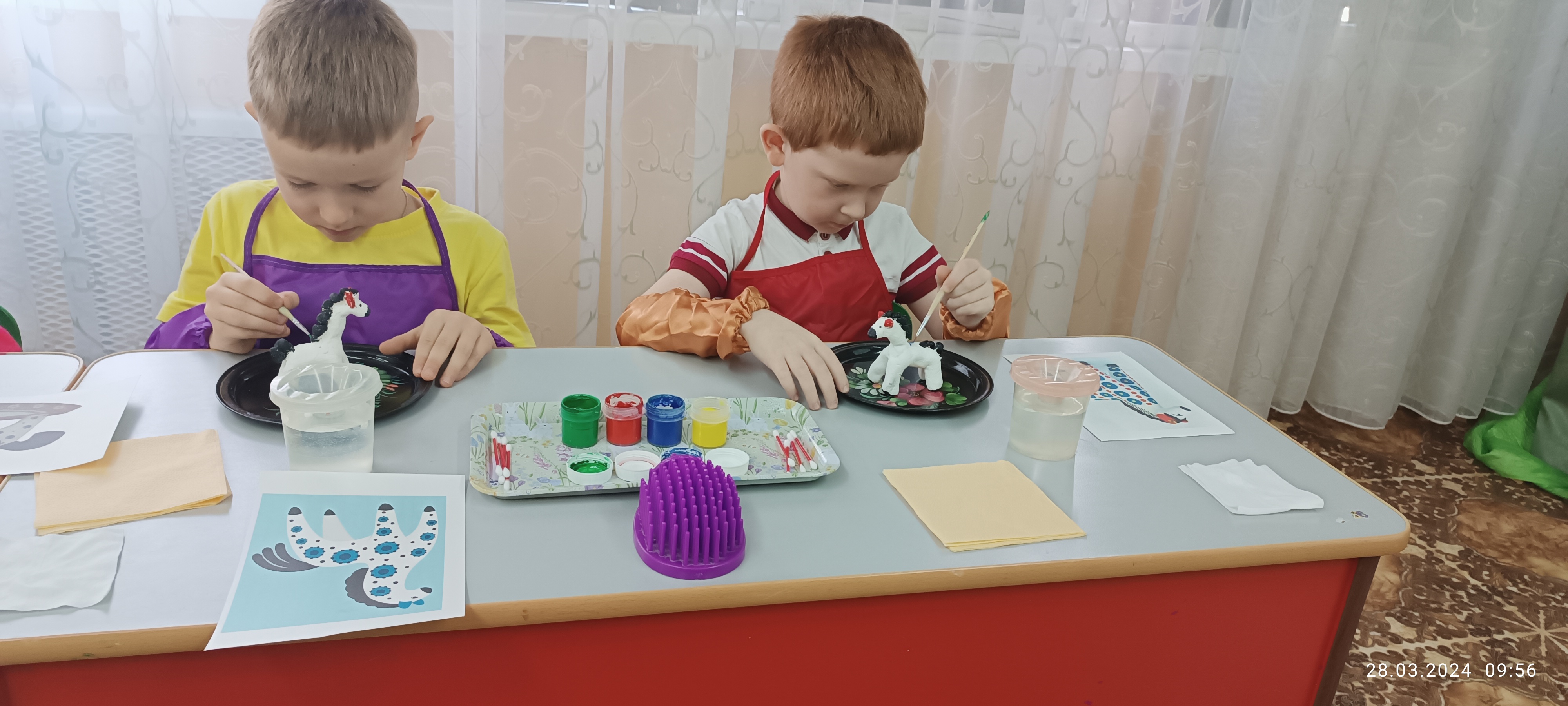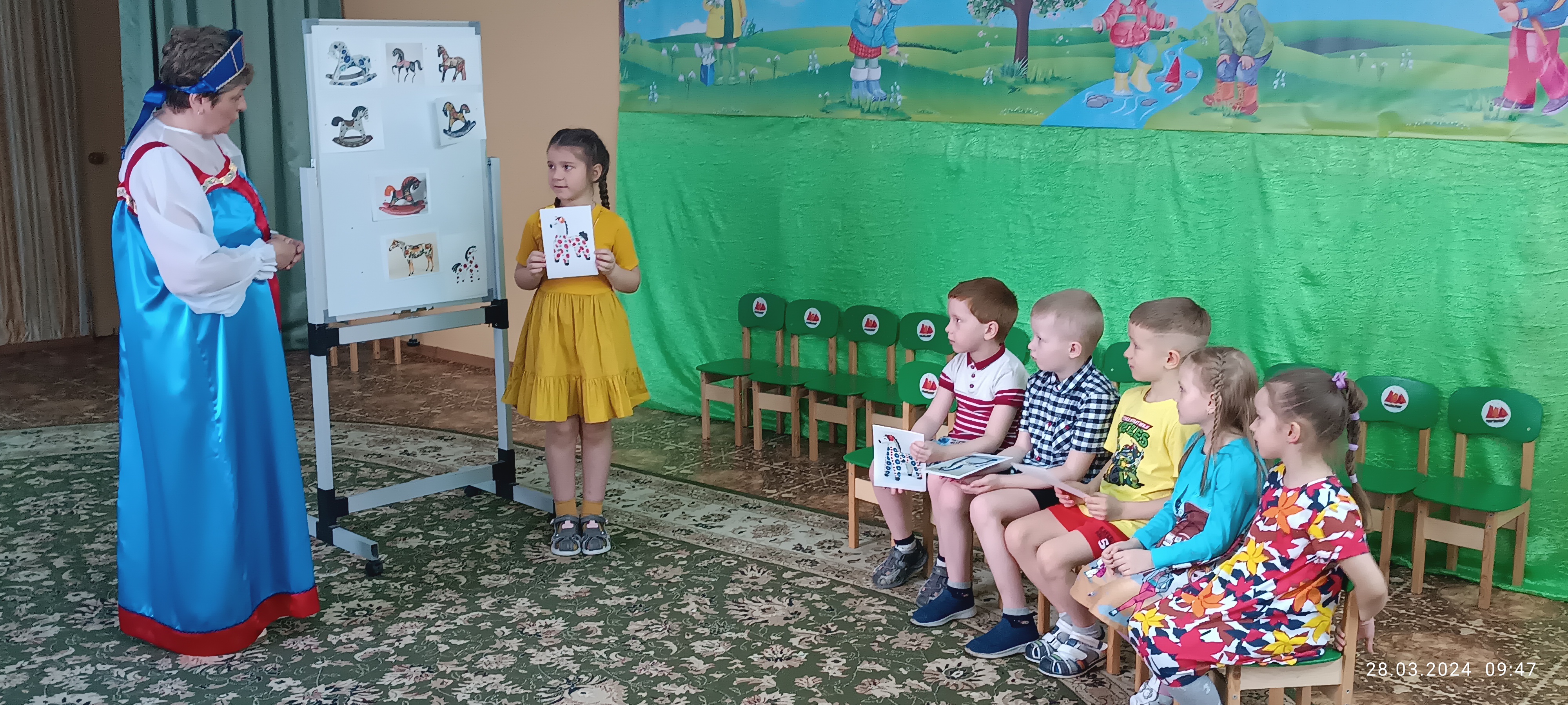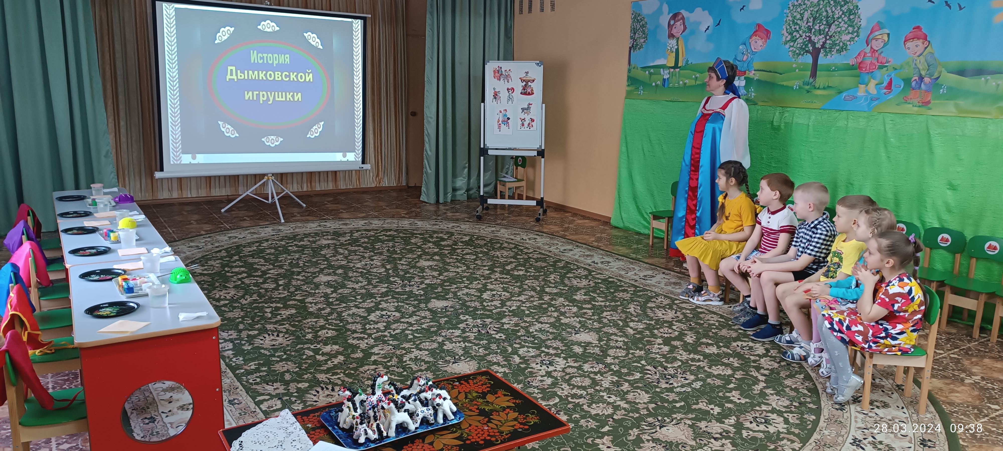 Согласно годовому плану работы ДОУ на 2023-24 г. и в рамках реализации второй годовой задачи «Развитие изобразительной деятельности дошкольников через знакомство с отдельными видами народных ремесел», в подготовительной к школе группе прошёл открытый просмотр занятия «В гости к Дымковской игрушке». Детей встретила Мастерица и пригласила в увлекательное путешествие в село Дымково, где они познакомились с творчеством дымковских мастеров и историей дымковской игрушки. Затем ребята сами стали мастерами, почувствовати себя в роли художников и с увлечением расписали Дымковских лошадок. Игрушки получились нарядными, яркими благодаря дымковским узорам и принесли детям море удовольствия!