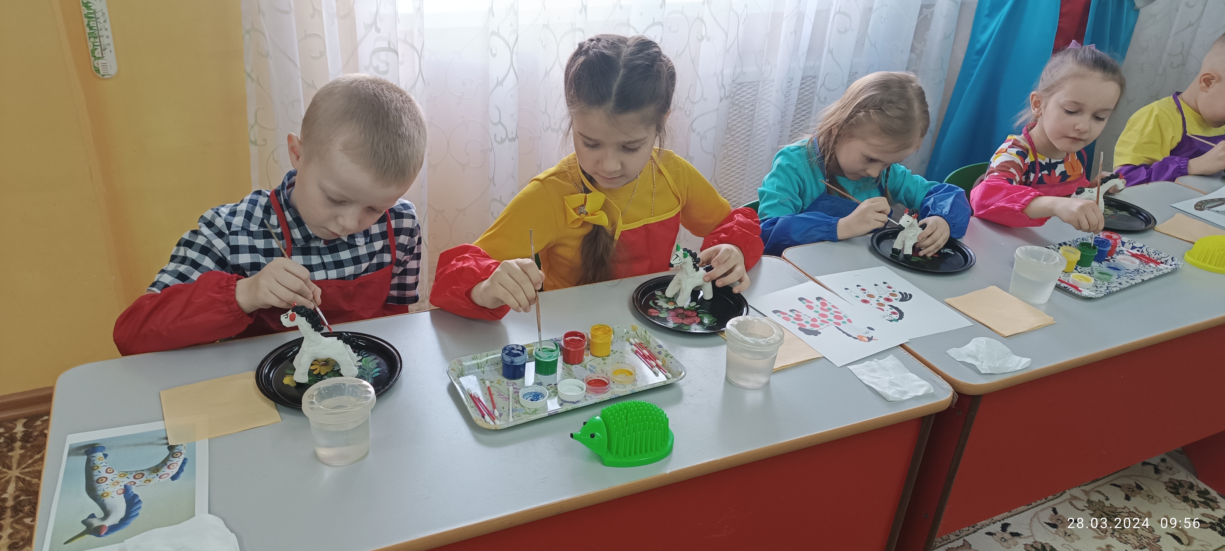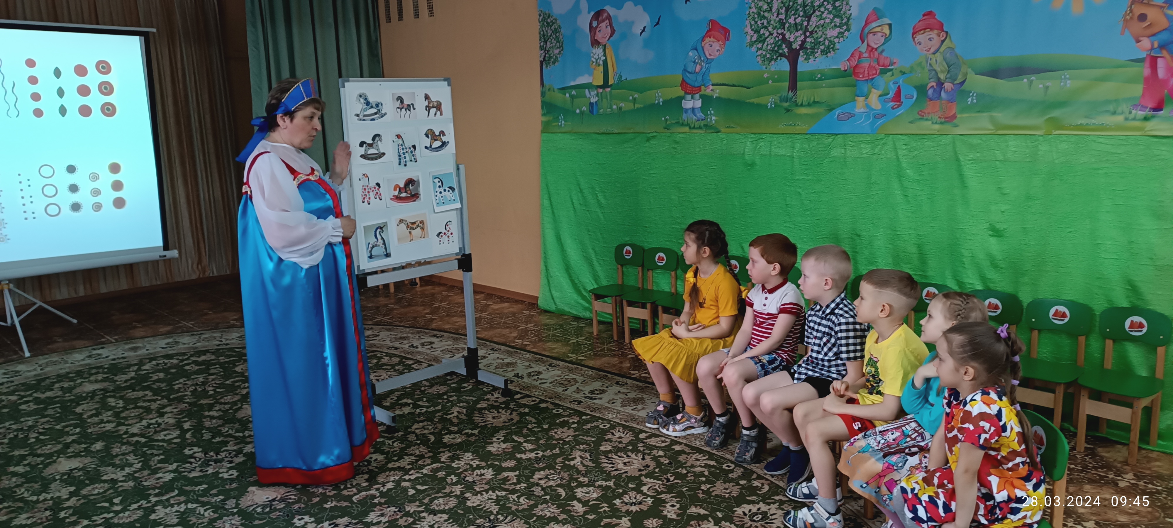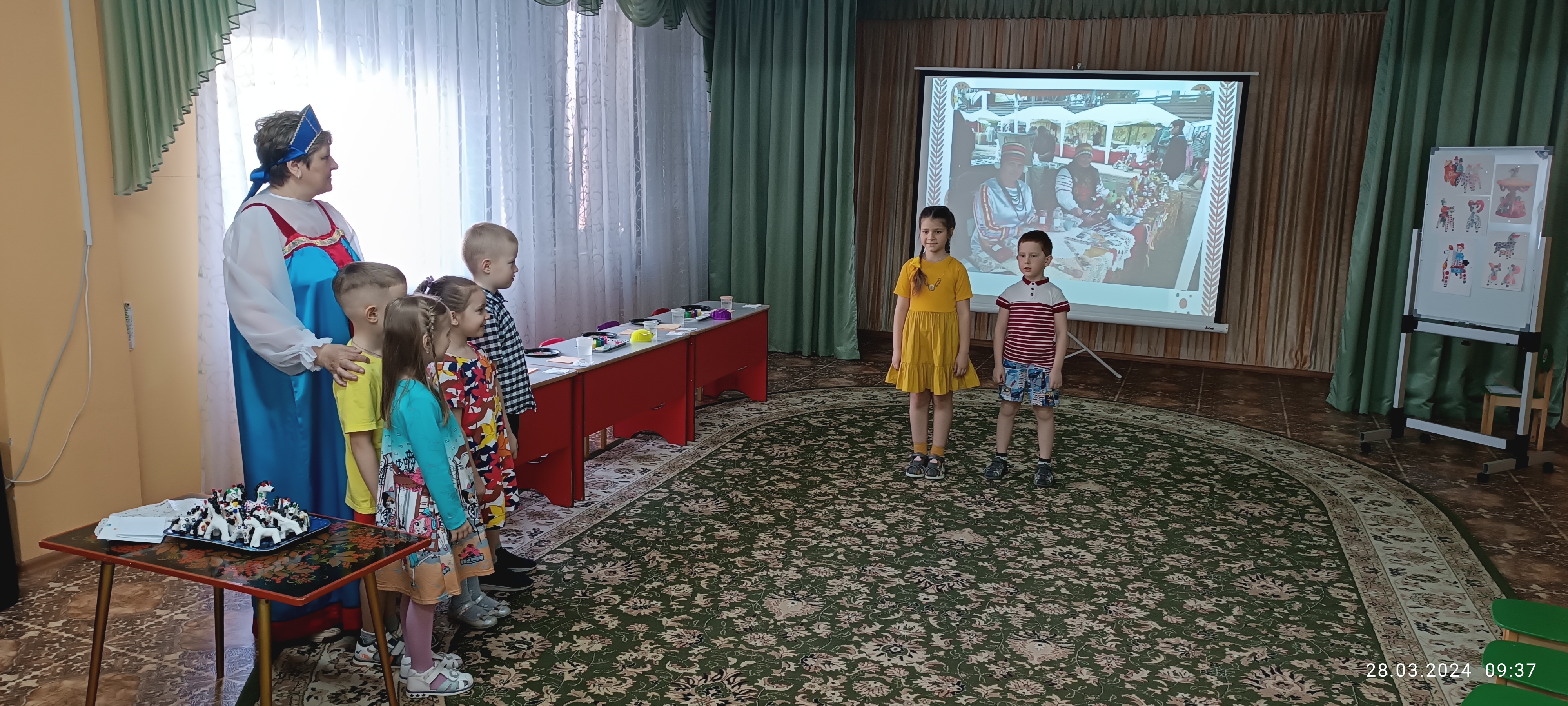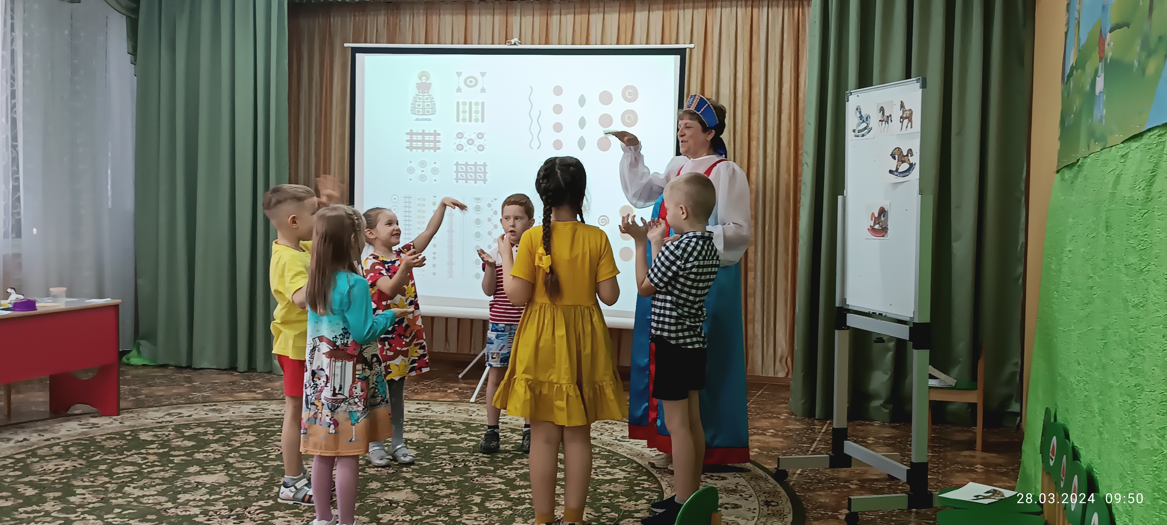 Согласно годовому плану работы ДОУ на 2023-24 г. и в рамках реализации второй годовой задачи «Развитие изобразительной деятельности дошкольников через знакомство с отдельными видами народных ремесел», в подготовительной к школе группе прошёл открытый просмотр занятия «В гости к Дымковской игрушке». Детей встретила Мастерица и пригласила в увлекательное путешествие в село Дымково, где они познакомились с творчеством дымковских мастеров и историей дымковской игрушки. Затем ребята сами стали мастерами, почувствовати себя в роли художников и с увлечением расписали Дымковских лошадок. Игрушки получились нарядными, яркими благодаря дымковским узорам и принесли детям море удовольствия!