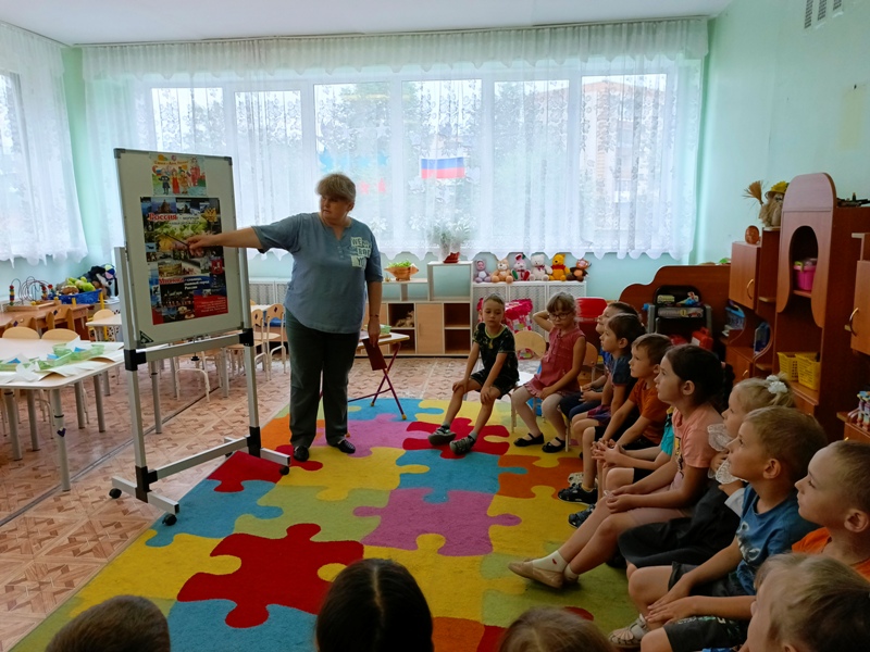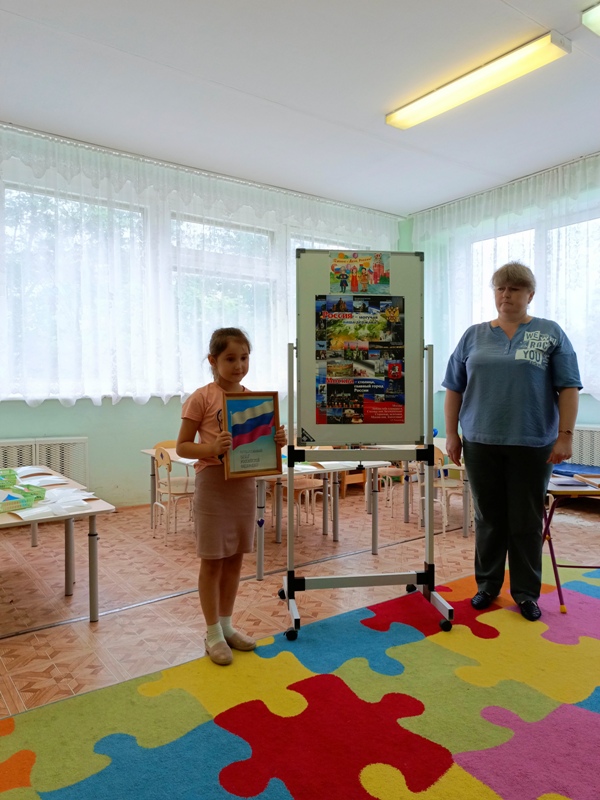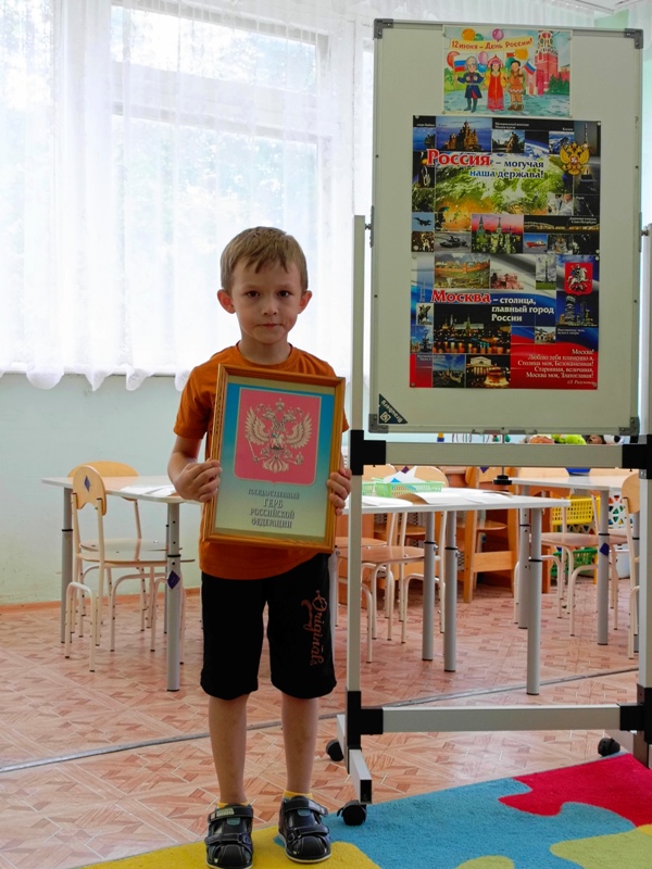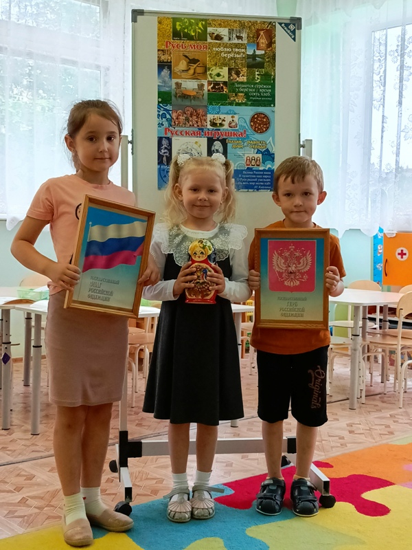 В нашем саду, в этот день, прошло тематическое занятие. Дети старшей группы №6 с любовью к Родине читали стихи, рассказывали о государственных символах и национальных традициях. Ребята закрепили свои знания о великой Державе – России. Итогом занятия стала продуктивная деятельность – дети изготовили своими руками аппликацию.